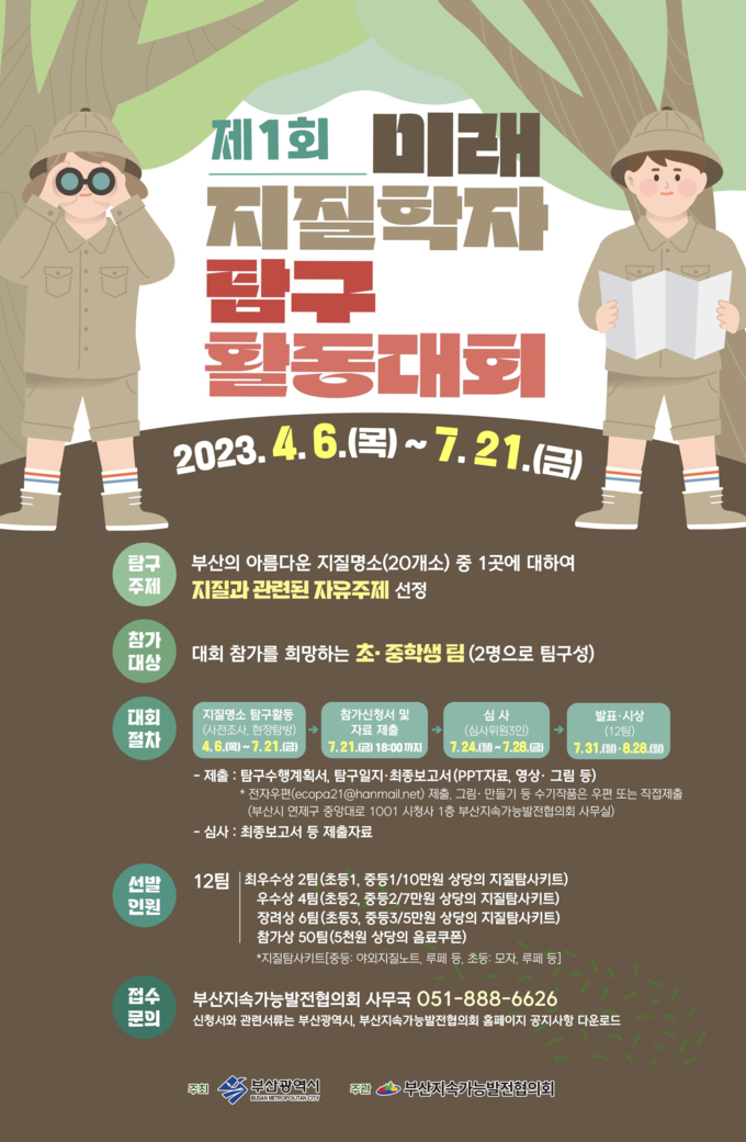 [경남도민뉴스] 부산시(시장 박형준)는 부산국가지질공원 관심 제고와 지역 인재육성을 위해 오는 7월 21일까지 ‘제1회 미래지질학자 탐구대회’를 개최한다고 밝혔다.