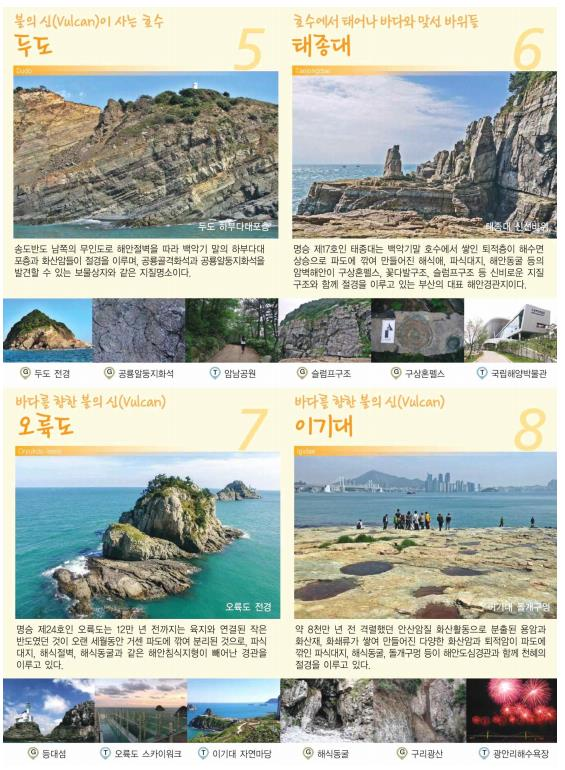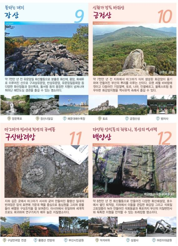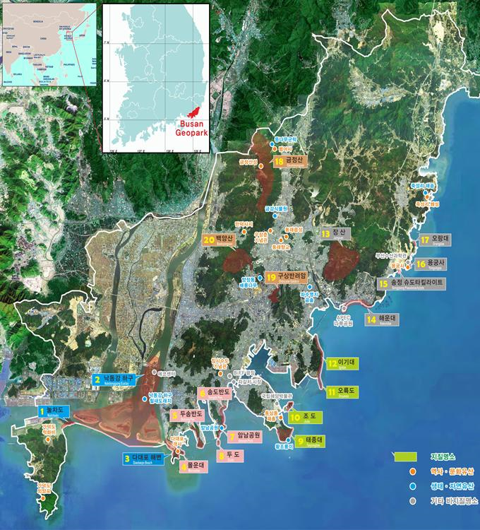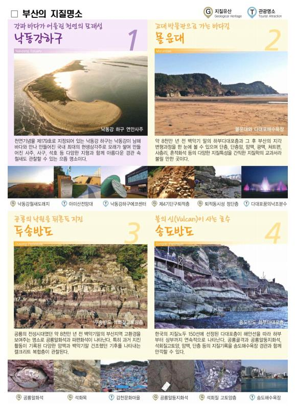 (20개명소) 눌차도·낙동강 하구·다대포 해변·몰운대·두송반도·두도·암남공원·송도반도·태종대·조도·오륙도·이기대·해운대·송정 슈도타킬라이트·용궁사·오랑대·장산·금정산·백양산·구상반려암