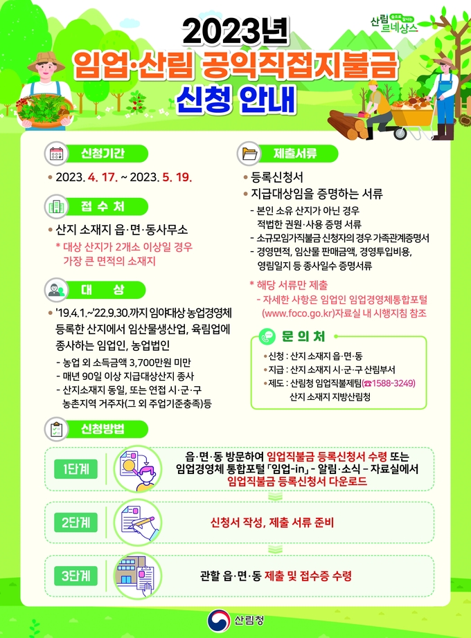 올해 임업직불금은 4월 17일부터 5월 19일까지, 산지 소재지(대상 산지가 2개 이상인 경우, 합계면적이 가장 넓은 곳) 읍면동사무소를 방문하여 신청해야 한다.