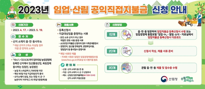 [경남도민뉴스] 경상남도(도지사 박완수)는 4월 17일부터 5월 19일까지 “2023년 임업ㆍ산림 공익직접지불금(이하 ‘임업직불금’)”을 신청을 받는다고 밝혔다.