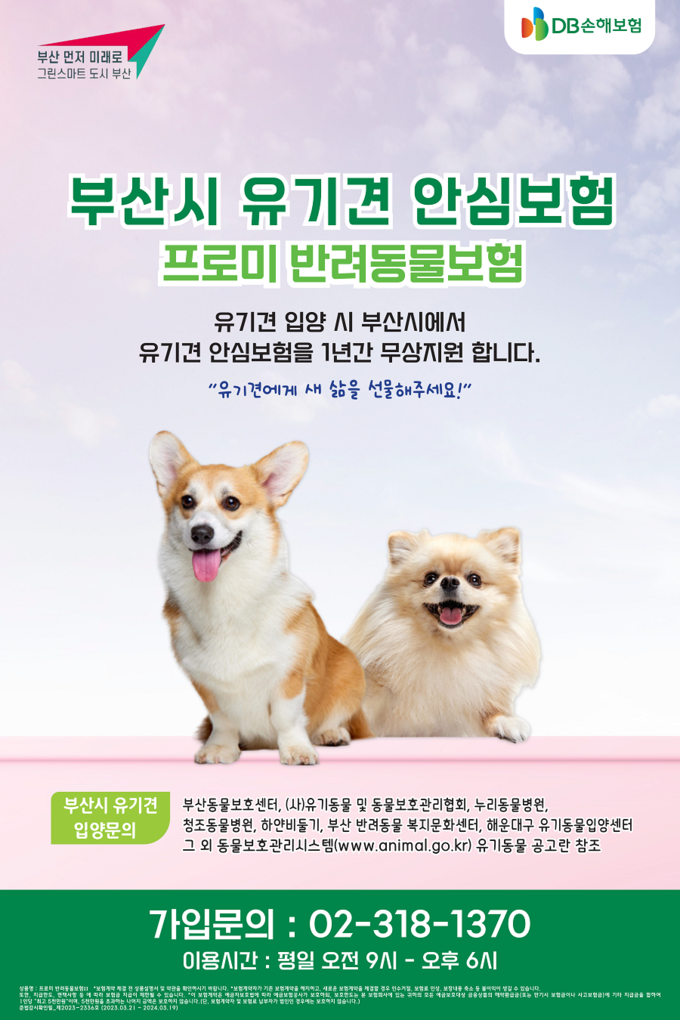 [경남도민뉴스] 부산시(시장 박형준)는 내일(21일)부터 부산시 소재 유기동물보호센터에서 유기견을 입양한 가족에게 1년간 펫보험을 무료로 지원하는 ‘2023년 유기동물 펫보험 지원사업’을 시행한다고 밝혔다.