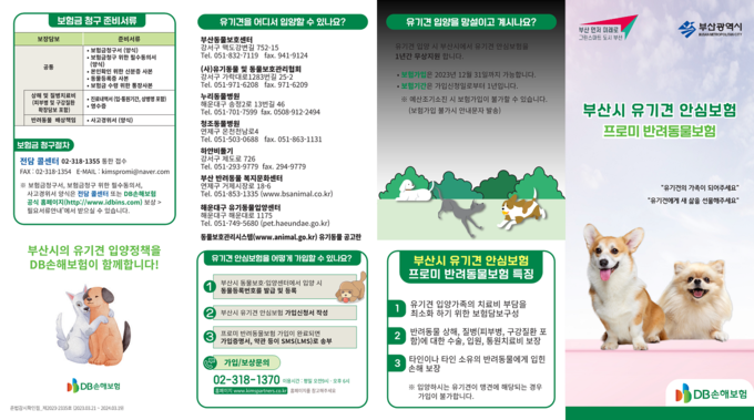 올해 부산시 지정 동물보호센터와 입양센터에서 내장형 동물등록을 완료한 유기견을 입양한 누구나 지원받을 수 있으며. 가입신청은 오는 12월 31일까지 동물보호센터 또는 입양센터에서 가능하며, 보험기간은 가입일로부터 1년간이다.