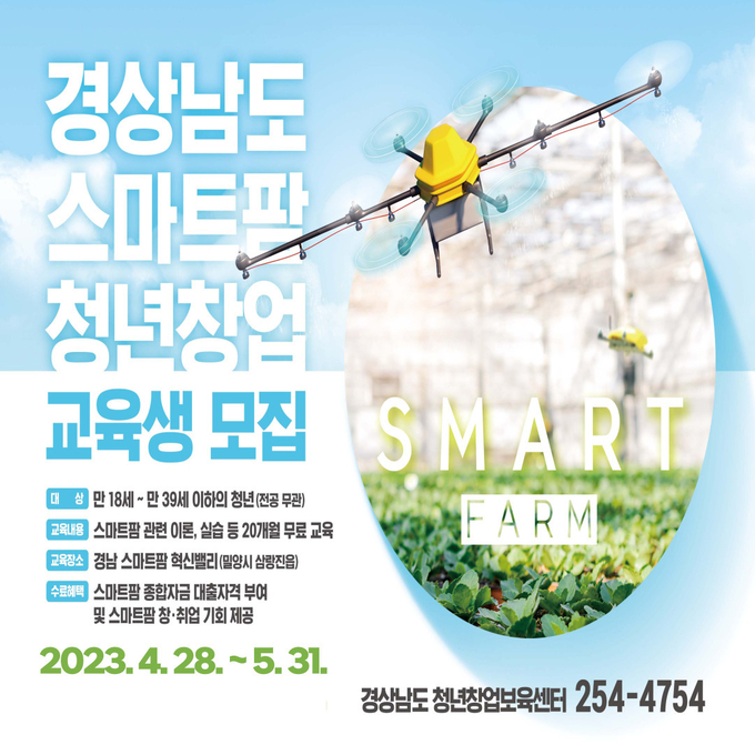 [경남도민뉴스] 경남도(도지사 박완수)는 미래농업의 핵심이 될 청년농업인을 육성하기 위해 ‘경상남도 스마트팜 청년창업보육과정’ 교육생을 전국적으로 모집한다.