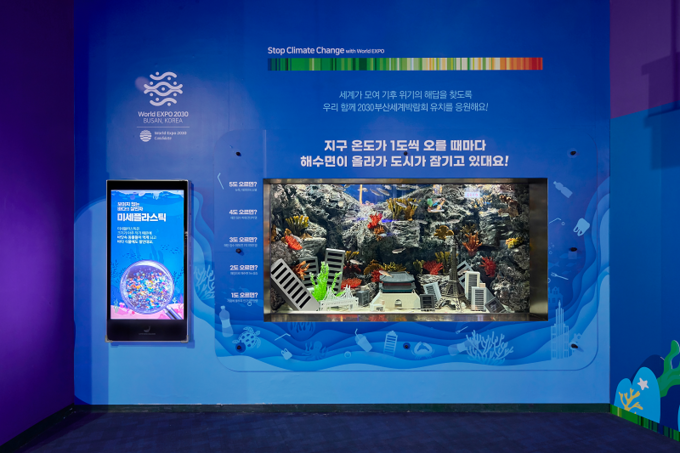 물이 가득 찬 수족관에 대한민국의 랜드마크인 남대문, 광안대교 등과 세계적인 랜드마크 에펠탑 등이 3D로 구현된 디오라마들이 잠겨 있어 기후위기를 직접 체감할 수 있다.