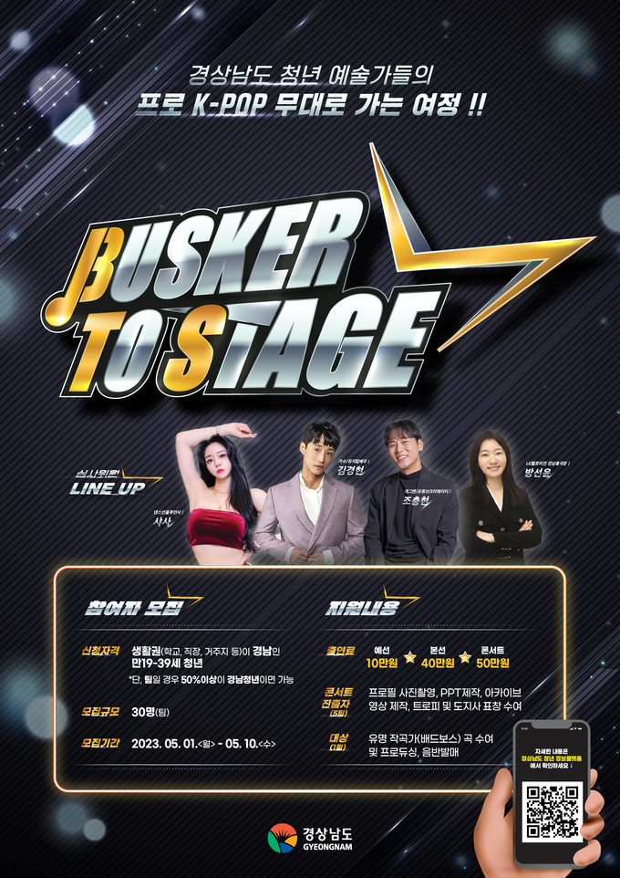 청년 거리문화 페스티벌은 ‘Busker To Stage’라는 슬로건으로 경남청년 예술가들의 프로 K-POP 무대로 가는 여정을 그려갈 계획이다. 학교, 직장, 거주지 등 생활권이 경남인 만19~39세 청년이면 누구나 신청할 수 있다. 팀인 경우에도 팀원의 50%이상이 경남청년이면 가능하다.