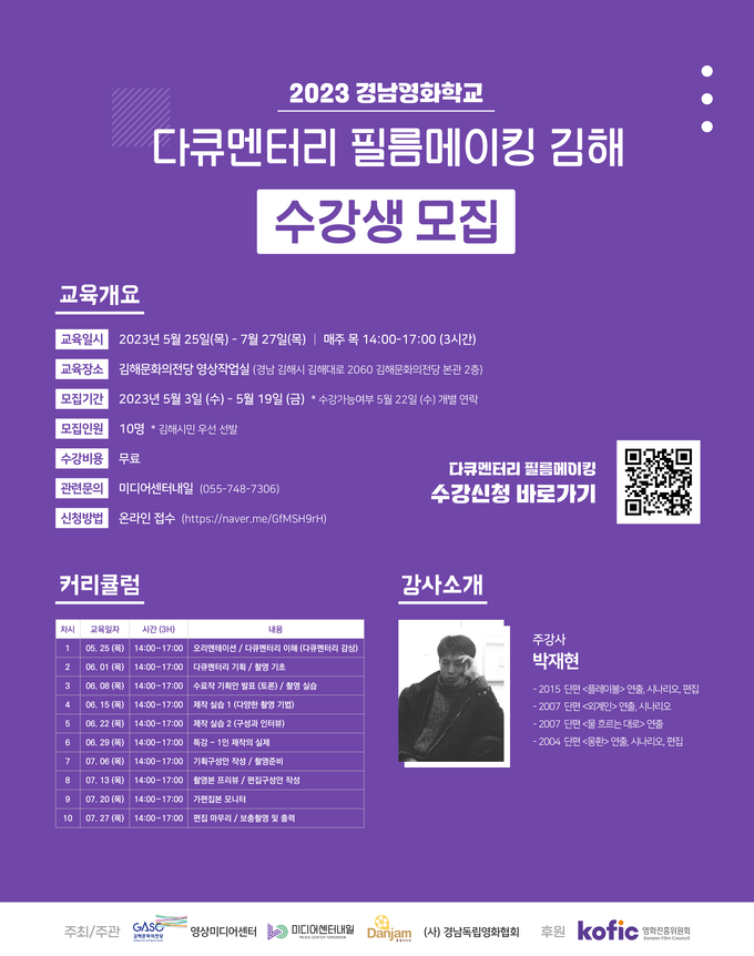 ‘2023 경남영화학교 <다큐멘터리 필름메이킹 김해>’는 영화진흥위원회의 2023 지역 영화문화활성화 지원사업으로 무료로 이뤄지며, 주최・주관으로 김해 문화의전당 영상위원회, 미디어센터내일, 공공미디어단잠, (사)경남독립영화협회가 참여한다.
