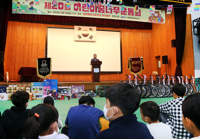 시는 제101회 어린이날을 맞이해 밀양문화체육회관과 동명중·고등학교, 두 곳에서 어린이날 기념행사를 열었다.
