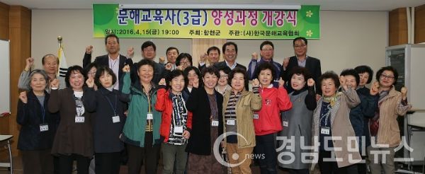 합천군(군수 하창환)은 지난 15일, 종합사회복지관 5층 다목적실에서 ‘2016년도 성인문해교육사 3급 양성과정’ 개강식을 가졌다.