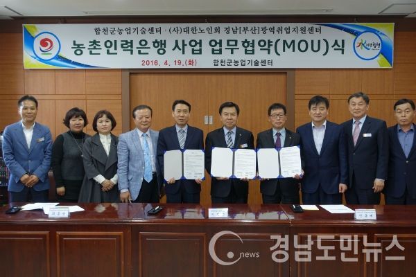 합천군농업기술센터(소장 이진출)와 (사)대한노인회 경남광역취업지원센터(센터장 최종상)는 지난 19일 농업기술센터에서 ‘농촌인력은행 사업’의 업무협약을 체결했다.