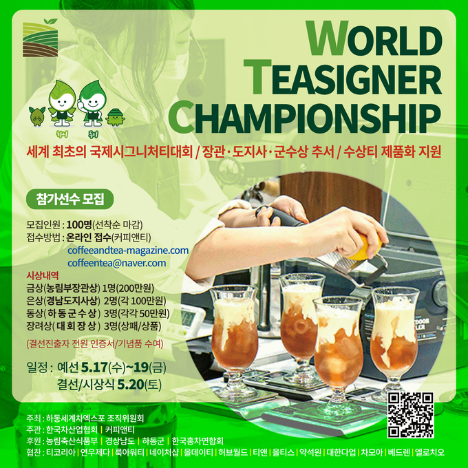 세계 최초의 글로벌 티메뉴 대회인 올해 ‘월드 티자이너 챔피언쉽(WTC)’에는 해외선수 3명을 포함해 총 50여 명의 도전자들이 참가한다. 이들은 5월 17~19일까지 3일간의 예선을 거치게 되며, 여기서 뽑힌 15명의 결선 진출자들이 20일 재격돌을 통해 금상(농림축산식품부 장관상) 1명, 은상(경상남도지사상) 2명, 동상(하동군수상) 3명, 장려상 3명의 주인공을 가리게 된다.