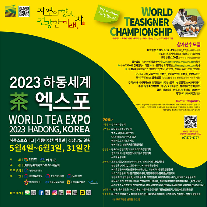 한편, 2023하동세계차엑스포는 경남도와 하동군이 공동 주최하고 (재)하동세계차엑스포조직위원회가 주관하는 차 분야에서 최초로 정부 승인을 받은 국제행사다. 오는 5월 4일부터 6월 3일까지 31일간 하동스포츠파크와 하동야생차문화축제장에서 ‘자연의 향기, 건강한 미래, 차(茶)!’라는 주제로 개최된다.