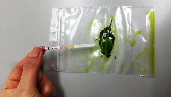 현장 이용방법은 제공된 완충액에 식물을 갈아 즙액을 낸 후, 진단키트 아래쪽 1cm 부위에 담그고 즙액이 막대를 따라 손잡이 쪽까지 따라 올라온 후 막대 중앙에 형성되는 붉은색 줄로 확인한다.