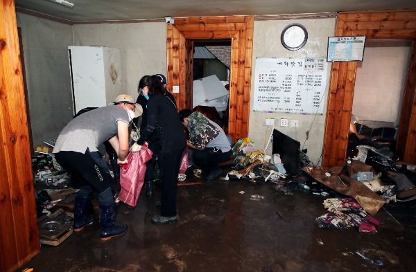 특히 화개계곡에서 쏟아진 폭우로 전날 완전히 물에 잠긴 화개장터는 9일 새벽에 물이 빠지면서 오전 8시 30분부터 공무원·상인·사회단체 회원 등 390여명이 장터에 집결해 점포·주변도로·상점 등 곳곳에 쌓인 펄과 쓰레기 등을 제거했다.