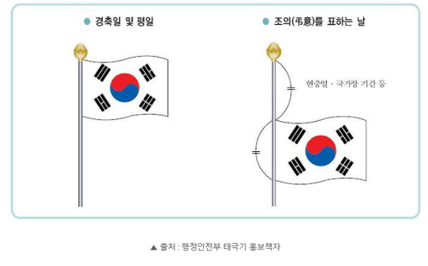 대통령령인 대한민국 국기에 관한 규정 제12조(국기의 게양일)를 보면 3·1절과 현충일(조기), 제헌절, 광복절, 국군의 날, 개천절, 한글날 등에는 태극기를 게양해야 한다.