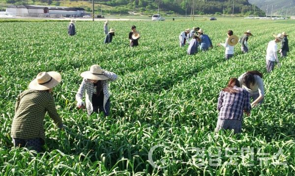 지난 4일부터 4일간 부경대학교 인문사회과학대학 학생 150명이 일손이 부족한 쌍책면 하신마을, 덕곡면 학동마을, 청덕면 가현마을을 찾아가 20ha 면적의 마늘 밭에서 마늘쫑 제거작업을 실시했다.