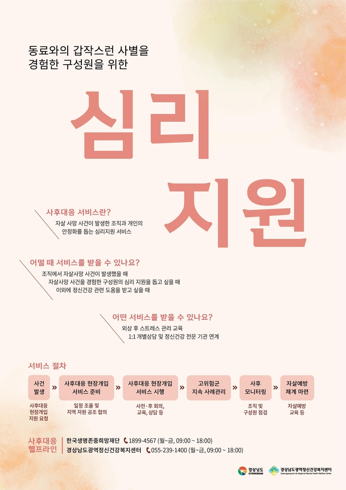 한편, 사후대응 서비스 이용을 희망하는 조직은 사후대응 헬프라인(☎1899-4567) 또는 경상남도광역정신건강복지센터(☎239-1400, 내선 1번)로 전화하면 된다.