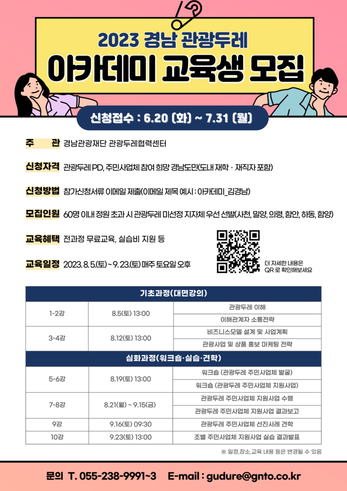 교육 참여를 희망하는 경우 경남관광재단 누리집(www.gnto.or.kr)에 공고된 신청서와 증빙서류를 7월 31일까지 전자우편(gndure@gnto.or.kr)으로 접수하면 된다.