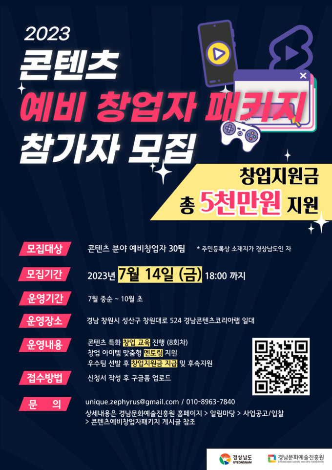 [경남도민뉴스] 경상남도(이하 도)는 도내 문화콘텐츠 분야 창업 활성화를 위해 예비 창업자를 밀착 지원하는 ‘2023년 예비 창업자 패키지 지원사업’을 추진한다.