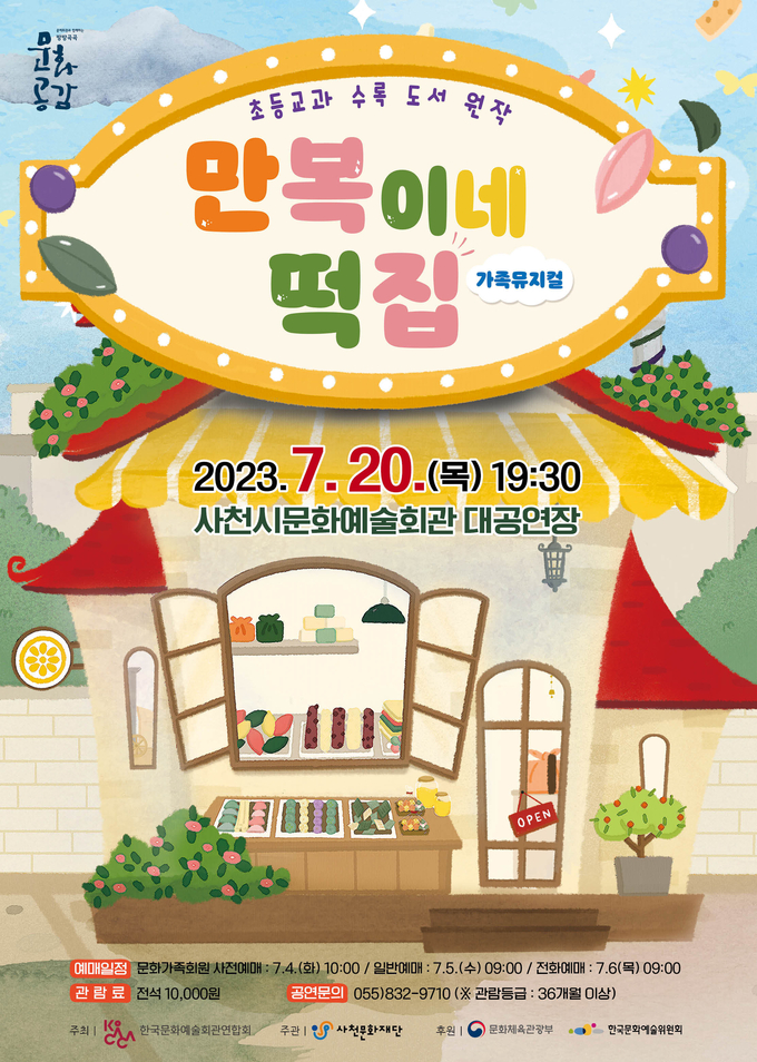 [경남도민뉴스] 사천문화재단(대표이사 김병태)은 7월 20일 오후 7시 30분 사천시문화예술회관 대공연장에서 가족 뮤지컬<만복이네떡집>을 선보인다.