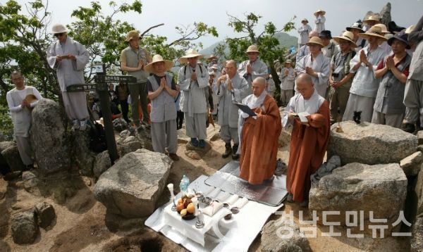 이날 행사에는 해인사 주지 향적 스님을 비롯한 100여명의 스님이 매화산 남산제일봉 정상 오방(五方)과 불꽃이 피어오르는 형상의 남산제일봉 화강암 바위 사이사이에 한지로 감싼 소금봉투를 묻어 각종 재난과 자연재해, 화재로부터 안전하기를 기원했다.