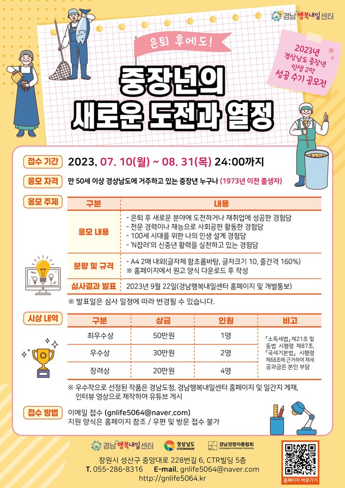 공모전 주제는 “은퇴 후에도 중장년의 새로운 도전과 열정! 인생 이야기”로 ▲은퇴 후 새로운 분야에 도전하거나 재취업에 성공한 경험담 ▲전문 경력이나 재능으로 사회공헌 활동 경험담 ▲100세 시대를 위한 나의 인생 설계 경험담 ▲‘N잡러’의 신중년 활력을 실천하고 있는 경험담 등이다.