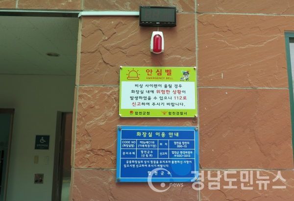 이는 최근 서울 강남역 인근에서 '묻지마 살인사건'이 발생하는 등 여성을 대상으로 한 강력범죄가 증가함에 따라 공중화장실에서 발생할 수 있는 성폭력이나 폭행 등 범죄 예방은 물론 각종 사고에 신속하게 대응하고자 합천경찰서와 협조하여 설치한 것이다.