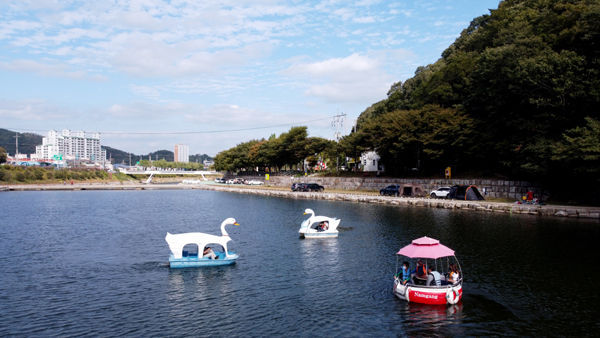 한글날을 포함해 3일간의 연휴 마지막 날인 11일 오후 의령군의 대표적인 관광명소인 의령천 구름다리 주변에서 가족나들이객들이 오리배를 타며 코로나19로 지친 심신을 달래며 즐거운 시간을 보내고 있다.