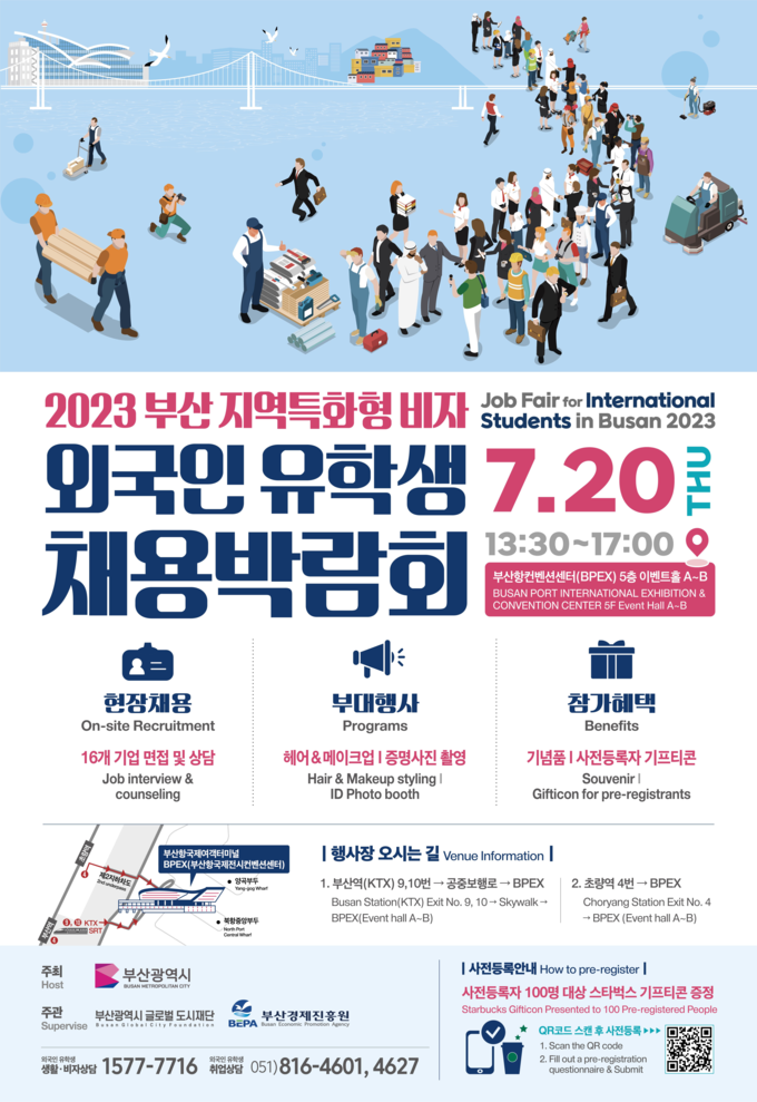 [경남도민뉴스] 부산시(시장 박형준)는 지역기업의 인력난 해소와 외국인 유학생 일자리 제공을 통한 지역 정착을 위해 내일(20일) 오후 1시 30분 부산항국제전시컨벤션센터(BPEX)에서 ‘외국인 유학생 채용박람회’를 개최한다고 밝혔다.