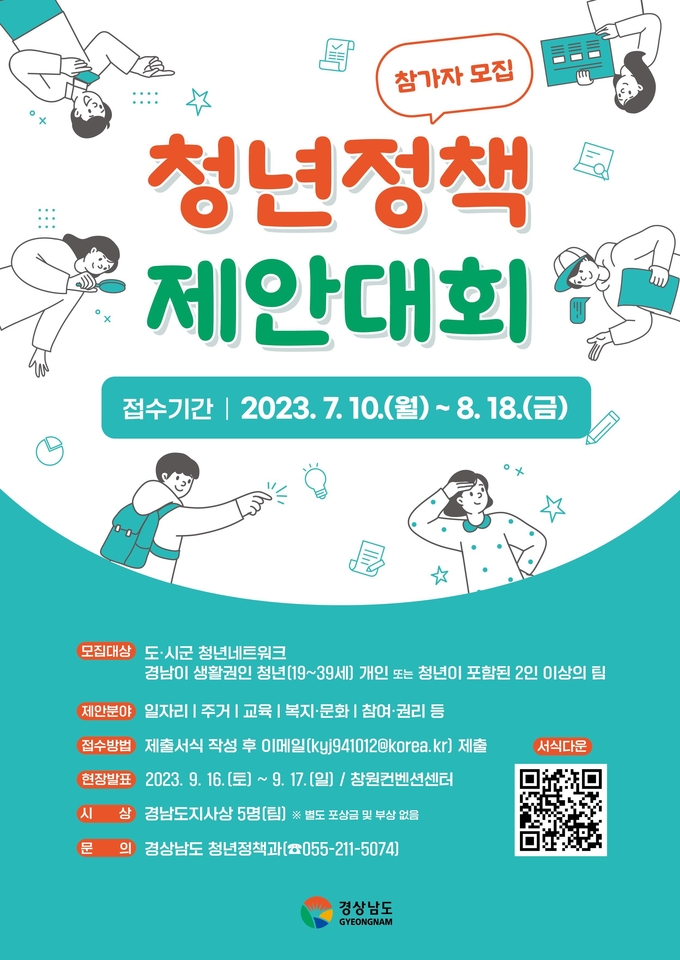 [경남도민뉴스] 경남도(도지사 박완수)는 도내 청년들을 대상으로 청년정책에 대한 관심을 유도하고 청년이 직접 발굴한 정책 아이디어를 도정에 접목하기 위한 ‘청년정책 제안대회’를 오는 9월 15일부터 열리는 2023 경남청년주간행사 중 개최한다고 밝혔다.