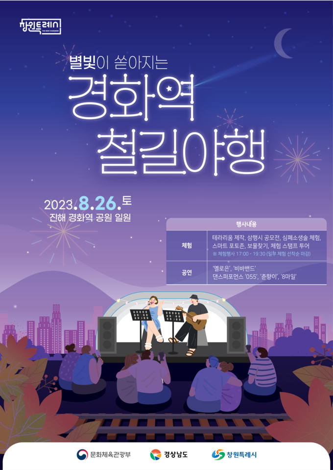 [경남도민뉴스] 창원특례시(시장 홍남표)는 ‘별빛이 쏟아지는 경화역 철길야행’ 행사를 오는 8월 26일 토요일 오후 5시에 진해구 경화역 공원에서 개최한다고 밝혔다.