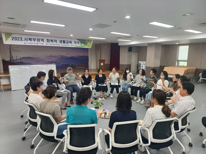 이번 연수는 ‘회복적 대화(Responsive circle)’를 연습하는 과정으로 경청연습, 사전모임(갈등상황파악, 대화모임이 자신에게 미치는 의미, 대화모임에 초대할 대상파악), 본모임(갈등관계에서 자신의 느낌과 진심을 말하게 하고, 상대방이 들은 대로 돌려주는 과정을 통해 강한감정을 조절할 수 있도록 하는 한편, 앞으로의 관계 재설정을 위한 약속), 사후모임(약속에 대한 축하 및 수정제안), 긴급갈등개입 등의 내용을 담았다.