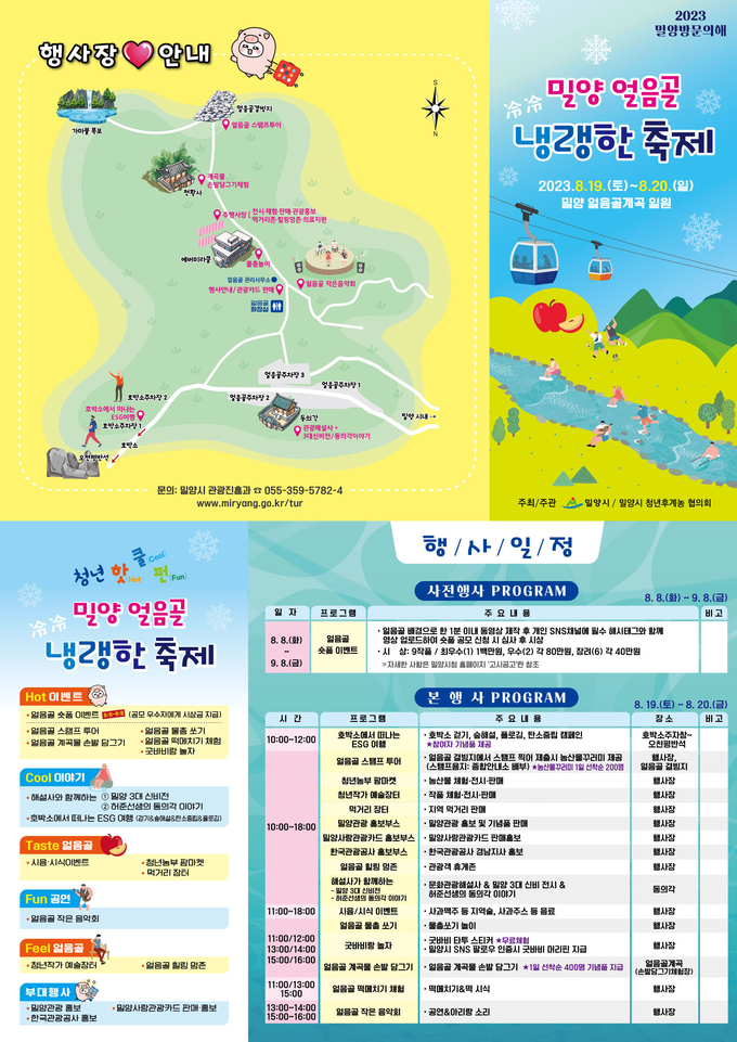 그밖에 청년농부 팜마켓, 청년작가 예술장터, 먹거리 장터, 떡메치기 체험, 얼음골 힐링 멍존 등 2023년 마지막 여름을 가족들, 연인과 함께 추억을 만들고 싶다면 꼭 밀양 산내면 얼음골을 찾아주길 바란다.
