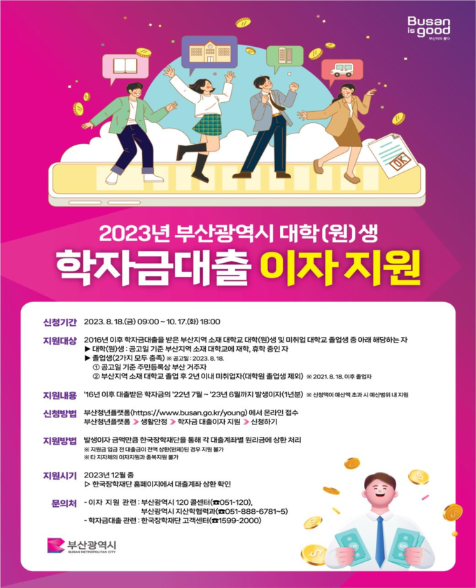 [경남도민뉴스] 부산시(시장 박형준)는 오늘(18일)부터 「2023년 부산광역시 대학(원)생 학자금대출 이자지원 사업」 신청자를 모집한다고 밝혔다.