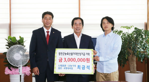 (합천/권연홍 기자) = 합천군 쌍백면 소재 LS엠트론․LS농기계 합천․의령대리점(대표 최금석)은 지난 8일 합천군청을 방문하여 농축산물 가격안정기금 조성에 보태달라며 3백만원을 하창환 군수에게 전달했다.