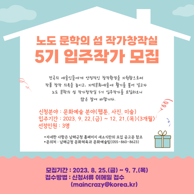 이번 5기 입주작가 모집분야는 기존 문학 분야가 아닌 문화예술 분야 중 웹툰, 사진, 미술이며 선정된 예술인들은 입주시점인 9월 22일부터 3개월간 작가창작실에 머물며 창작활동에 전념할 수 있다.