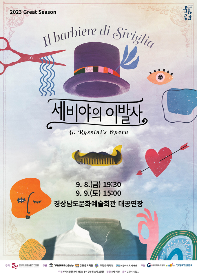 오페라 세비야의 이발사와 관련된 자세한 내용은 경남문화예술회관 전화(☎1544-6711)와 누리집(artcenter.gyeongnam.go.kr)으로 확인할 수 있다. ▲공연일시 9월 8일 19:30, 9월 9일 15:00 ▲관람연령 8세 이상 ▲티켓 V석 6만 원, R석 4만 원, S석 3만 원, A석 2만 원.