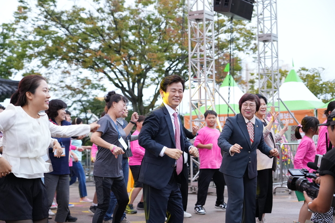 특히 초등학생부터 80대 어르신까지 1080 전 세대가 어우러진 플레시몹 댄스에는 100여 명의 참가자와 조규일 진주시장 등 내빈들이 함께하여 개막식장을 축제의 한마당으로 만들었다.