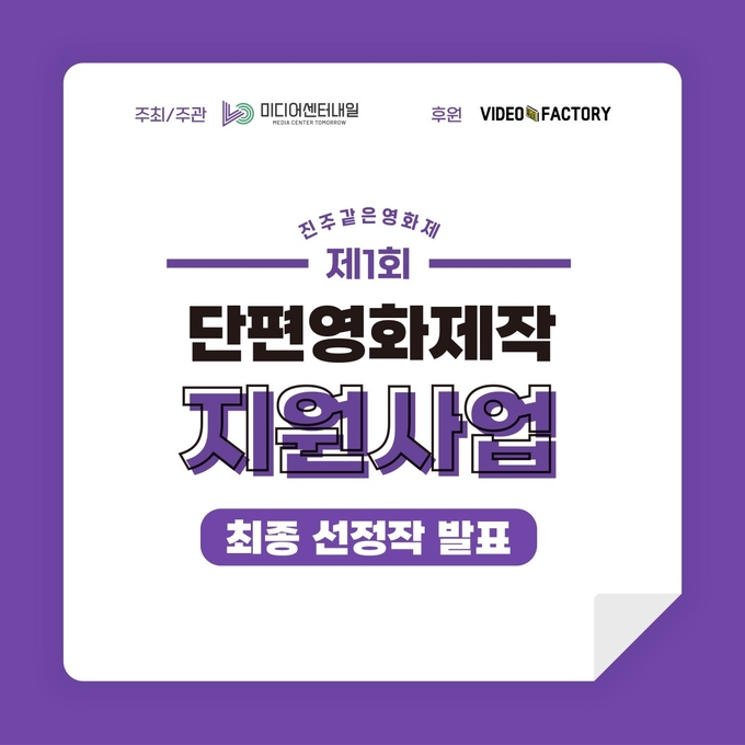 작품은 1차 서류 심사, 2차 시나리오 피칭을 통해 선정했으며, 2차 시나리오 피칭에는 제작사 ATO의 제정주 대표와 김현정 영화감독이 외부 심사위원으로 참여했다.∘진주같은영화제 제1회 단편영화제작지원사업은 미디어센터내일이 주최・주관하며, 지난 5월 미디어센터내일과 ‘지역영화영상문화 증진 MOU’를 맺은 비디오팩토리가 후원한다.