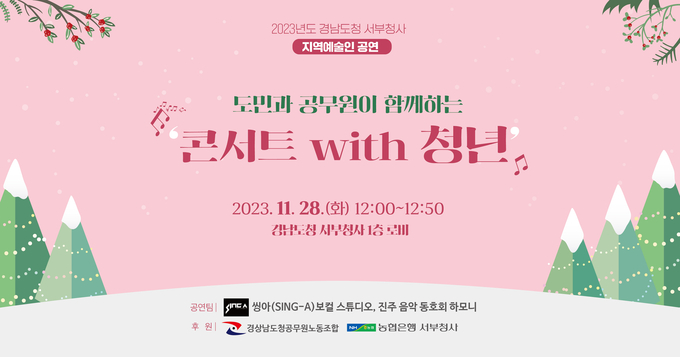 [경남도민뉴스] 경남도는 오는 11월 28일(화) 낮 12시 경남도청 서부청사(진주시 소재) 1층에서 진주 지역청년 음악인 2개팀(하모니, 씽아(SING-A)보컬스튜디오*)를 초청해 ‘콘서트with청년’라는 주제로 공연을 개최할 예정이다.