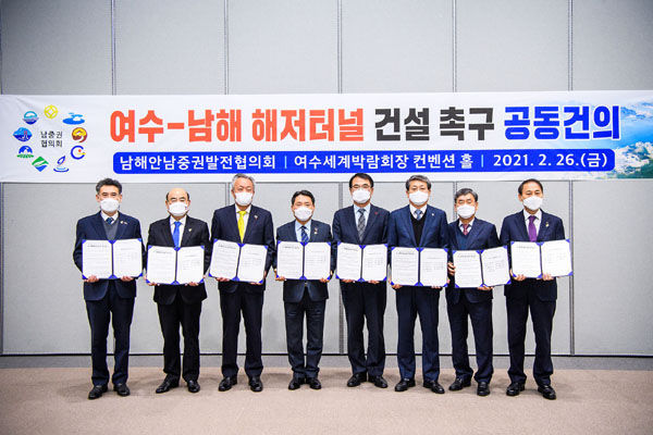 김경수 경남지사, 김영록 전남지사, 권오봉 여수시장, 장충남 남해군수가 26일 남해~여수 해저터널 건설 촉구 공동 건의문에 서명한데 이어, 각계 각층의 서명과 공동건의문 발송이 이어질 전망이다.