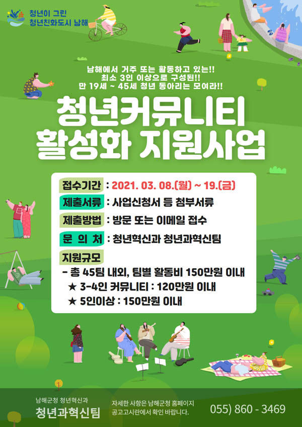 남해군에 거주 또는 활동하는 청년(만 19세~만 45세) 3인 이상으로 구성된 커뮤니티는 비영리단체 등록이나 고유번호증 발급 없이 누구나 신청가능하다.