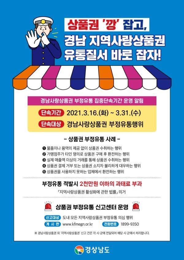 [경남도민뉴스] 경상남도는 오는 16일부터 31일까지 도내 지역사랑상품권 발행 시·군과 함께 부정유통 일제 단속을 실시한다고 밝혔다.