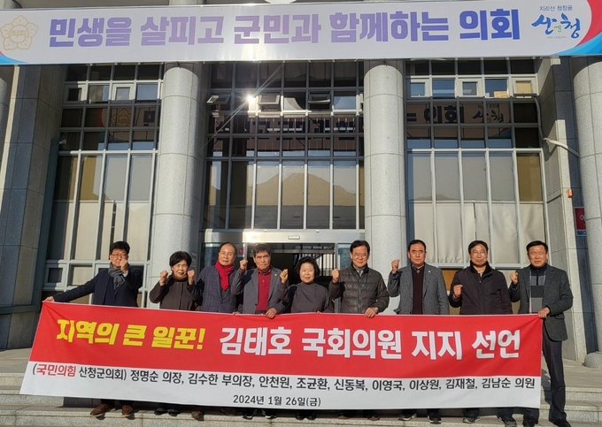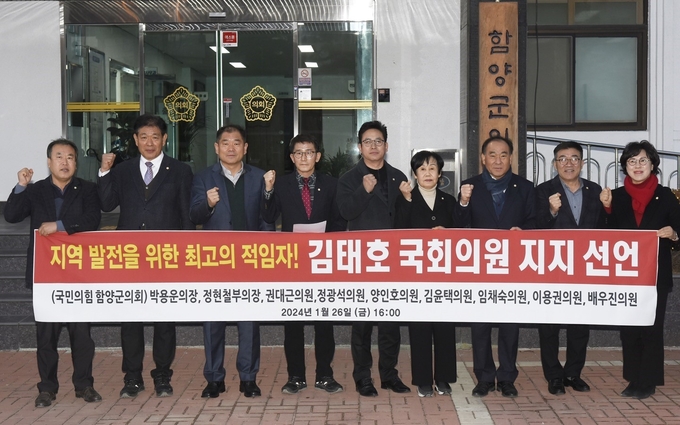 또 함양군의회도 26일, 박용운 의장을 비롯한 국민의힘 의원 9명 전원이 의회 앞에서 지지선언을 했다. 이들은 “김태호 의원은 지난 4년간 지역의 큰 변화를 위한 대규모 공모사업 지원과 우리 지역을 통과하는 달빛철도 건설 특별법 제정 등 지역 발전을 위한 변화에 큰 기여를 했다”라면서 “4선 국회의원은 중앙무대에서 더 큰 정치를 할 수 있는 기회가 될 것”이라고 강조했다.
