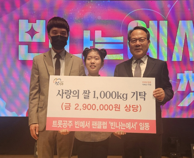 [경남도민뉴스] 진주출신 트로트 가수 빈예서의 팬클럽 ‘빈나는예서’는 지난 23일 지역 내 어려운 이웃을 위해 써 달라며 팬클럽 회원들이 모은 성금으로 마련한 백미 1000kg(환가액 290만 원 상당)을 진주시복지재단(이사장 이성갑)에 기탁했다.