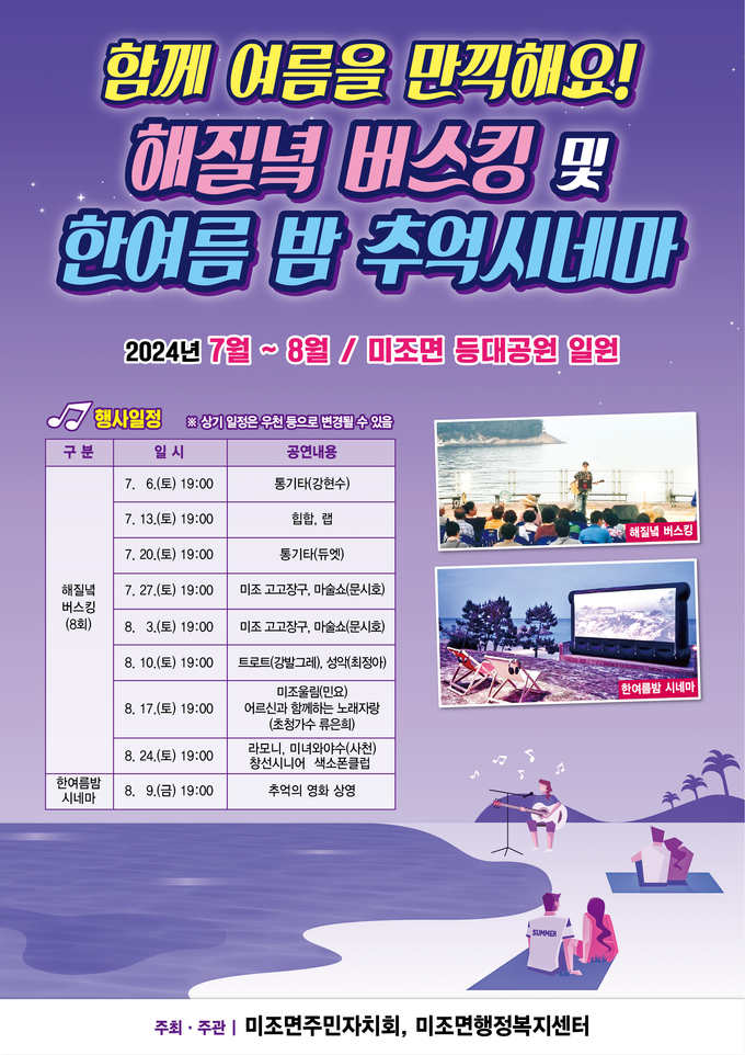 [경남도민뉴스] 미조면 주민자치회가 주최하고 미조면 행정복지센터가 주관하는 ‘해질녘 버스킹 및 한여름 밤 시네마’가 오는 7월 6일부터 8월 24일까지 매주 토요일 오후 7시 미조 등대공원 일원에서 펼쳐진다.