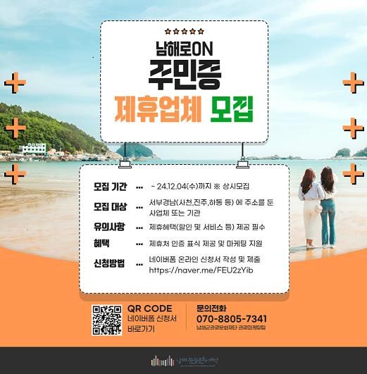 남해관광문화재단은 이 사업을 추진하기 위해 남해·사천·하동 등 서부지역에 사업장을 둔 업체 및 기관을 대상으로 제휴처 모집을 한다고 밝혔다.