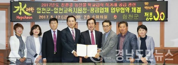 (합천/권연홍 기자) = 합천군(군수 하창환), 합천교육지원청(교육장 박성홍), 안전한 급식을 위한 합천생산자영농조합법인(대표 송영화)는 12일 군청 2층 소회의실에서 학교급식용 친환경농산물 직거래 공급을 위한 3자 협약을 체결했다.