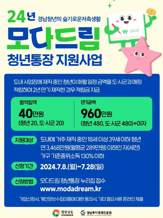 본 사업은 경남도 18개 시·군 총 500명 규모로 진행되며, 사업 수행기관인 경상남도투자경제진흥원의 모다드림 청년통장 누리집을 통해 온라인 신청을 받는다.