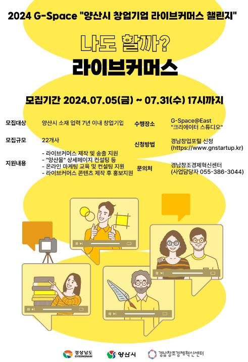 [경남도민뉴스] 양산시는 동부 경남 창업지원 거점인 G-스페이스 동부(G-Space@East)에서 ‘2024년 G-Space 라이브커머스 챌린지’에 참여할 업체를 모집한다고 밝혔다.