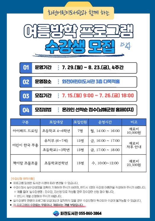 남해화전어린이도서관은 기존 정기휴관일인 화요일에도 도서관을 운영함으로써 보다 많은 어린이와 가족들에게 시원하고 쾌적한 독서환경을 제공할 계획이며, 학생들의 알찬 방학생활을 돕기 위해 4주간 여름 방학 특강 프로그램을 운영한다.